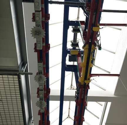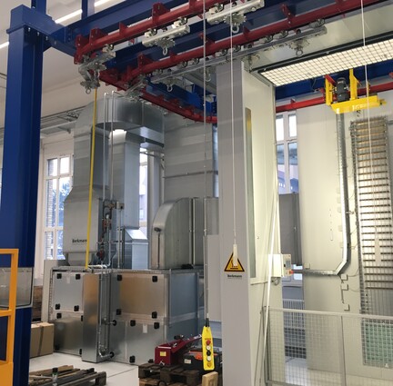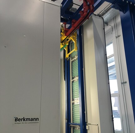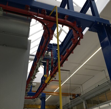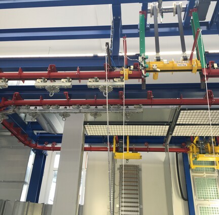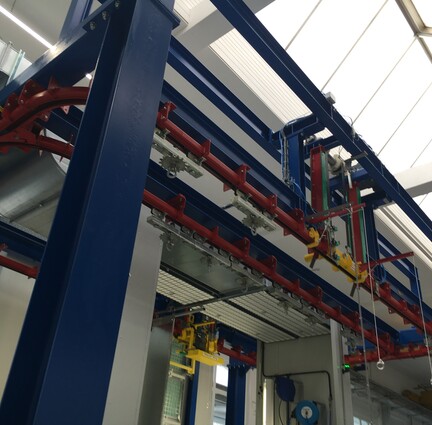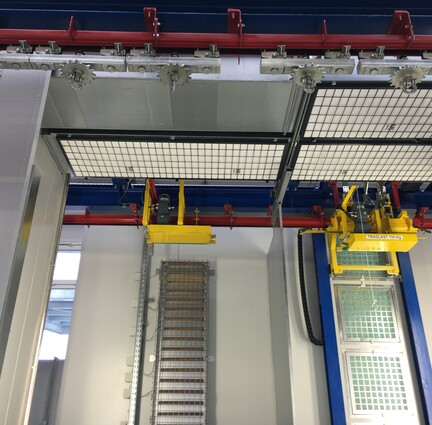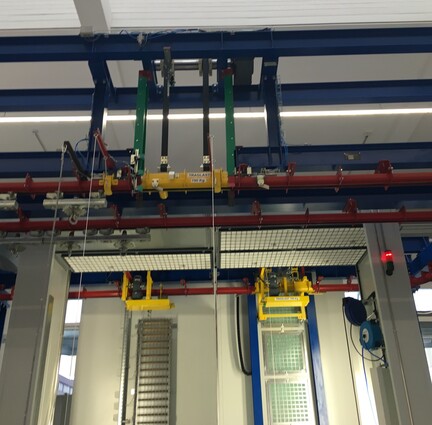 Die Aufnahme der Werkstücke in stehender Form wurde über eine Hub-Senkstation in der Fördertechnik realisiert. Werden die Werkstücke waagrecht angeliefert, so werden sie mit der Hub-Senkstation in eine senkrechte Lage gezogen. Eine Aufrichtfunktion kann für die Werkstücke über die Adapter erfolgen. Die Positionierung des Gehängewagens zur Nasslackierung erfolgt manuell und wird in der Lackierposition arretiert.